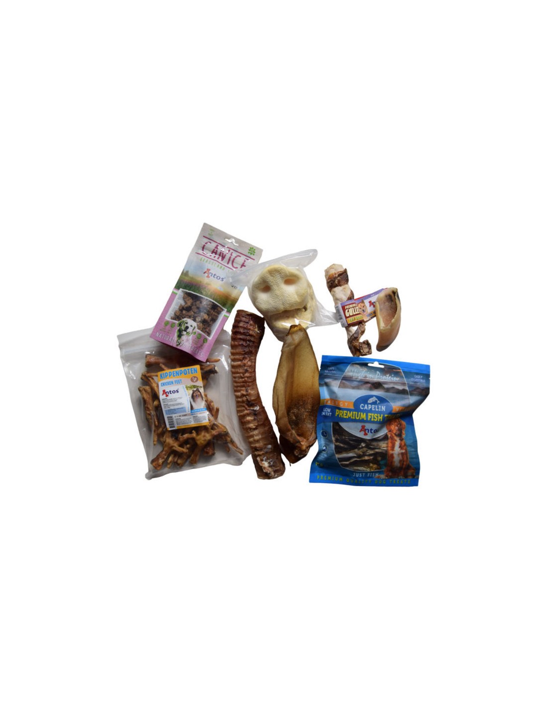C'est un assortiment de sept produits destiné aux propriétaires de chiens souhaitant offrir une variété de friandises savoureuses à leur compagnon canin. Ce coffret est composé de différents types de viandes et poisson séchées.